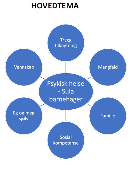 3. Årshjul for psykisk helse i barnehagen - bygd opp rundt 6 hovudtema som vi er forplikta til å jobbe med i løpet av året, tilpassa alle barnegruppene. Desse hovedtema er forankra i årsplan, periodeplan og vekeplan.