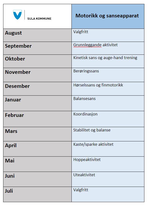 Aktivitetane vi skal gjennomføre blir presentert på eigne aktivitetskort, og dei er sett i system gjennom eit årshjul. Bevegelsesglede og meistring er nøkkelord. Barna skal oppleve at det det er gøy å bevege seg, dei skal trives i aktivitetane, få oppleve nye ting og såleis få tryggleik i eigen kropp. Det skal ikkje vere fokus på prestasjon, som fortest, flest og mest - men glede og å ha det gøy!